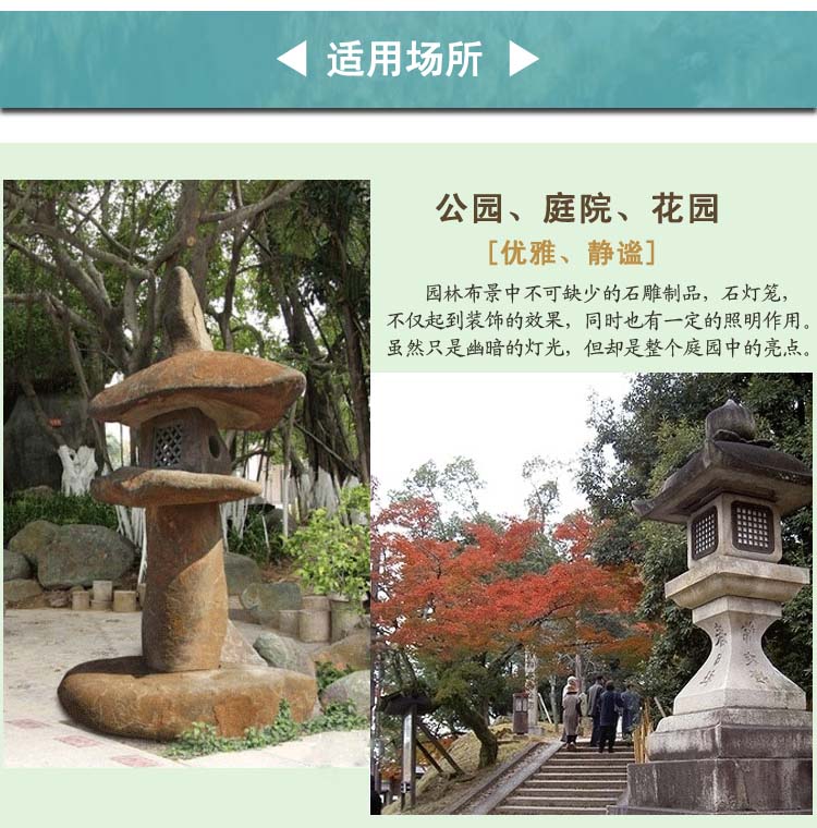 石燈籠是日本石文化的重要內容之一,也是近年來我國出口日本石制品的一個重要品種。石燈籠在日本有著非常悠久的歷史。在佛前獻燈火是佛教的重要禮儀之一,自奈良時代 (公元 710~ 794年 )起日本在修建寺院時就開始在寺院的正面建造石燈籠以保護向寺院所獻的燈火。日本現存的最古老的石燈籠是奈良時代的當麻寺石燈籠,距今已有一千多年的歷史了。到了江戶時代 (公元 1603~ 1867年 )石燈籠在日本已廣為流傳,一些寺院里造型精美的石燈籠被作為樣本模仿雕刻以至形成了石燈籠的各種形式。石燈籠被用于園林、庭院的裝飾始于十六世紀晚期的安土桃山時代,當時由于茶道的大發展,石燈籠常被作為茶室的一種露天裝飾物而廣泛進入庭院裝飾。隨著石燈籠用途的改變,石燈籠的樣式也就更加多樣化了,例如出現了三腳或四腳的雪見燈籠,同時對竿和笠的部分也給予新的設計,石燈籠的式樣由模仿進入創新?,F在日本的石燈籠除了少量用于寺院神社以外,大多數的石燈籠是用于庭院、園林裝飾使用。