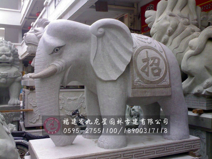 第一種是在雕塑石像時,在其腹部雕刻“招財進寶”字樣,每只大象各僅刻兩個漢字。雄性大象雕刻“招財”二字,雌性大象雕刻“進寶”兩個字。擺放遵循“左雄右雌”的原則,大象背對大門。這樣的話,來往的賓客就可以看到自身左側(cè)的為招財雄象,右側(cè)為進寶雌象雕塑,連起來即為招財進寶石雕大象。
