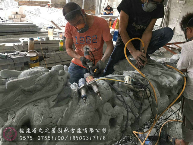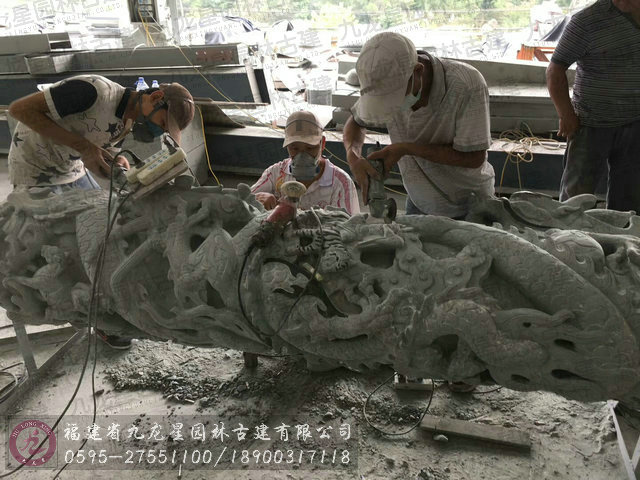 大量石雕青石龍柱現(xiàn)場加工中