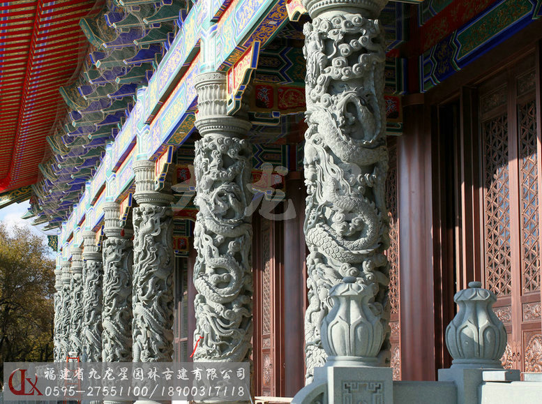 九龍星園林古建加工的寺廟石雕龍柱有單龍柱、雙龍柱、滾龍柱、盤龍柱、蟠龍柱、華表柱、龍鳳柱、八仙龍柱、青石龍柱等多種造型雕刻。我們通過專業且標準化的采購渠道,甄選優質的礦料,加工的寺廟石雕龍柱,大批量應用于寺廟建筑裝飾美化,贏得客戶好評。