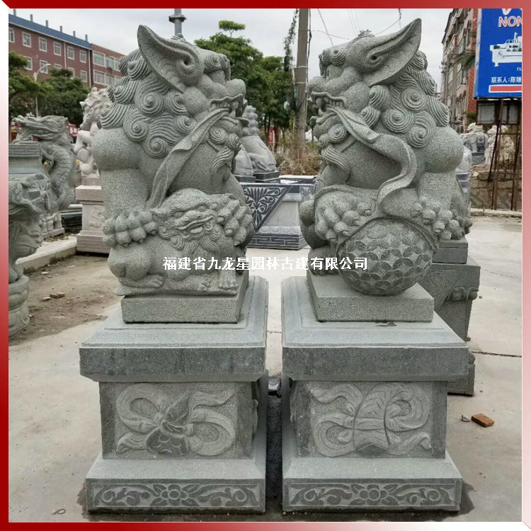 南派石獅子雕刻豐富,多彩有別,獻錢獅則是南派石獅子造型代表之一,因其以飾一串古錢而得名。因此,獻錢獅有著招**進寶的寓意,因為造型憨態可掬,少了幾分獅子的威嚴,多了幾分靈性,雄獅常飾于大串的銅錢,寓意招**進寶。而雌獅則戲玩著小獅子,寓意人丁興旺之意,同樣也是人們熱衷于選擇的造型之一。獻錢獅是中國石雕獅子造型中常見的一種,同樣常見的還有北方傳統的京獅石雕獅子。