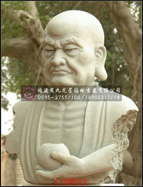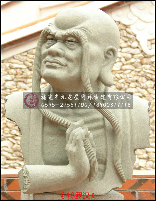 十八羅漢半身像雕塑采用天然優質石材花崗巖精雕而成,因為花崗巖的自然感染力,加上十八尊羅漢像惟妙惟肖,神態栩栩如生,使得整套羅漢雕像與園林形成渾然一體的感覺。