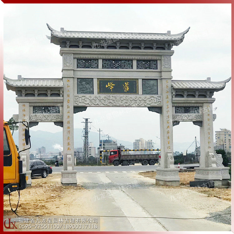 石雕三門(mén)牌坊,三門(mén)三樓石雕牌坊圖片,由石牌坊制作廠家九龍星園林古建制作。從石牌坊圖片來(lái)看,三門(mén)三樓石雕牌坊在不同場(chǎng)所應(yīng)用是比較多的,像農(nóng)村石牌坊、村莊石牌坊、宗祠石牌坊、墓地石牌坊、景區(qū)石牌坊、寺院石牌坊等,都有三門(mén)三樓石雕牌坊的身影。中國(guó)傳統(tǒng)的石雕技法圓雕、透雕、高浮雕、淺浮雕、平浮雕、陰線刻等,在三門(mén)三樓石雕牌坊的雕刻中廣為應(yīng)用。