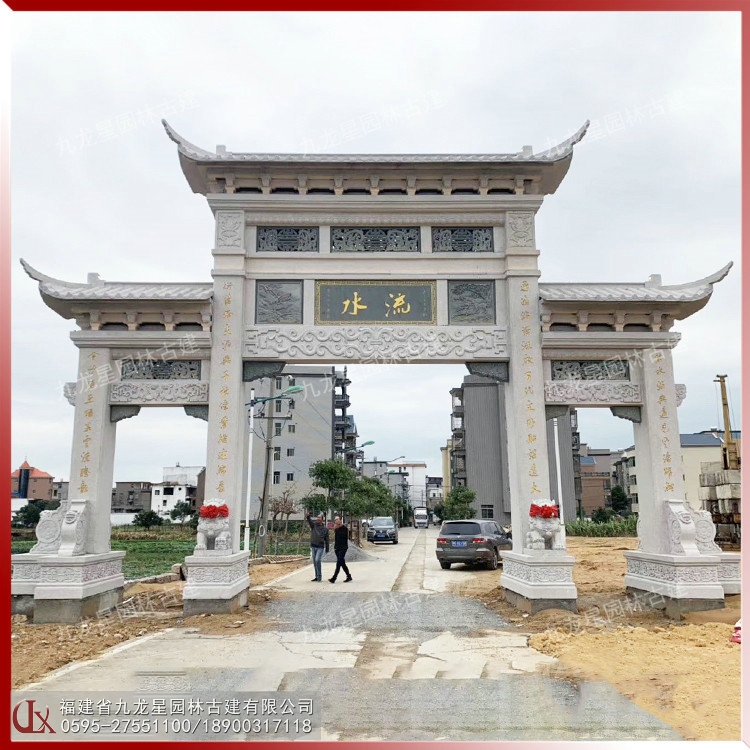 石雕三門(mén)牌坊,三門(mén)三樓石雕牌坊在雕刻藝術(shù)上也獨(dú)具特色,通常中門(mén)以深浮雕、透雕為主,邊門(mén)雕刻的是淺浮雕吉祥花鳥(niǎo),形成呼應(yīng)、疏密、節(jié)奏感和韻律。有的則雕刻祥龍騰云駕霧浮雕,雕刻這種浮雕圖案的石牌坊可以帶來(lái)吉祥好運(yùn),村莊安裝這樣的一座三門(mén)三樓石牌坊可以化解當(dāng)?shù)馗鞣N不好的風(fēng)水煞,這種村莊石雕牌坊可以改善村莊運(yùn)氣,使村莊紅紅火火,人財(cái)兩旺。