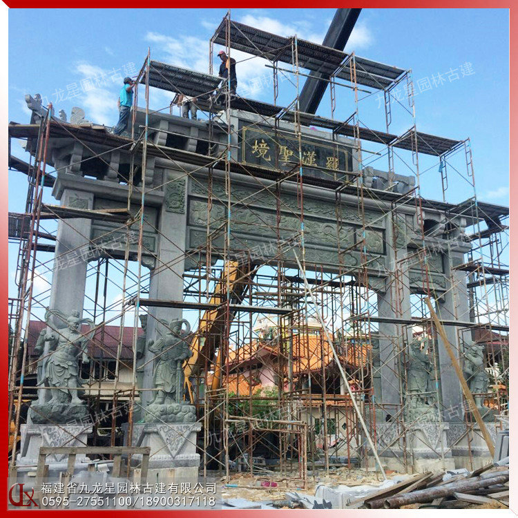石牌坊定制 牌坊兩側雕刻護法神將大型山門石雕